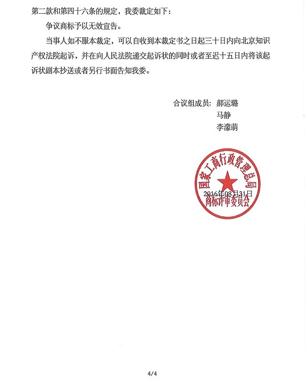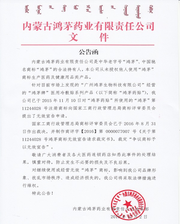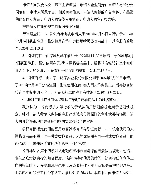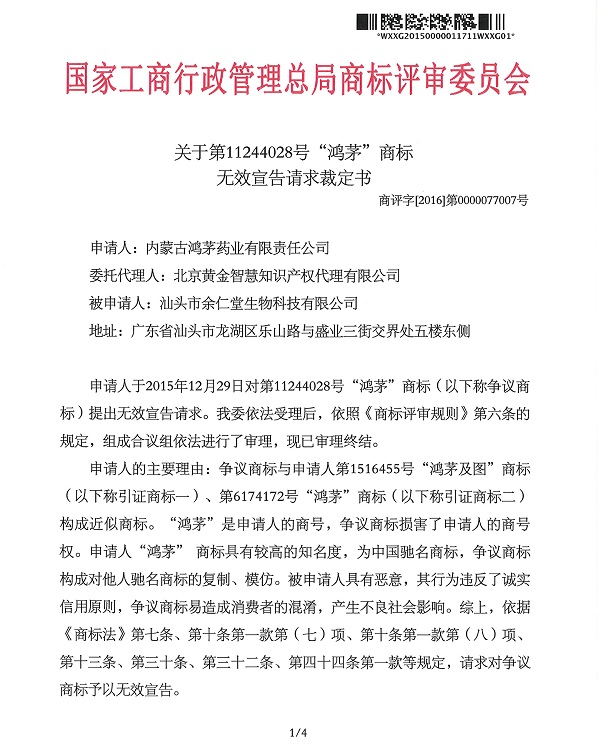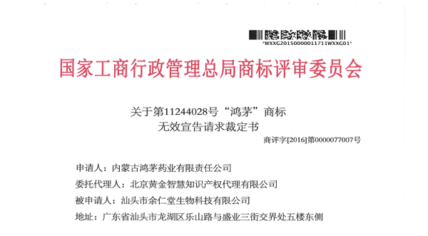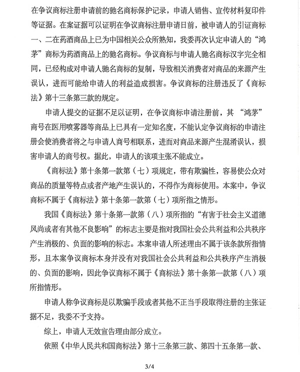 關(guān)于“鴻茅”商標(biāo)無(wú)效宣告請(qǐng)求裁定書(shū)