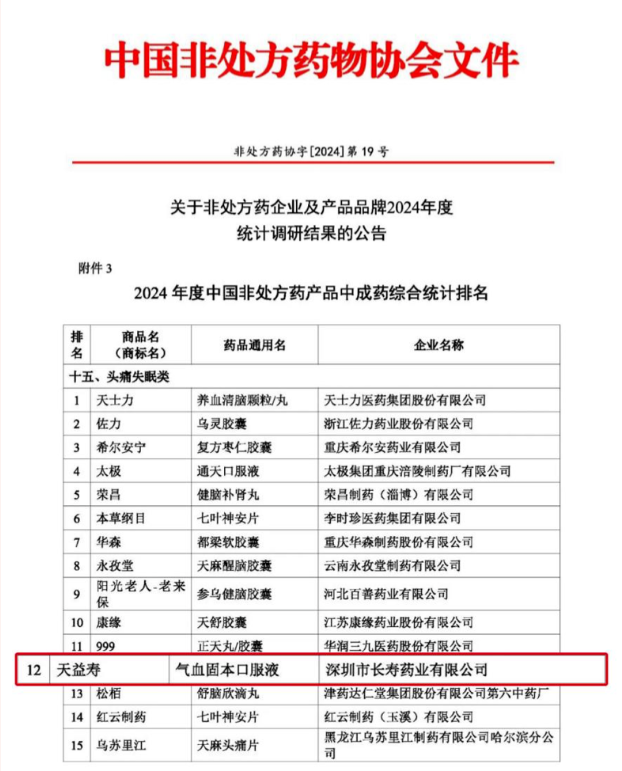氣血固本口服液入選《2024年度中國非處方藥產(chǎn)品中成藥綜合統(tǒng)計排名-頭痛失眠類產(chǎn)品》品牌榜單